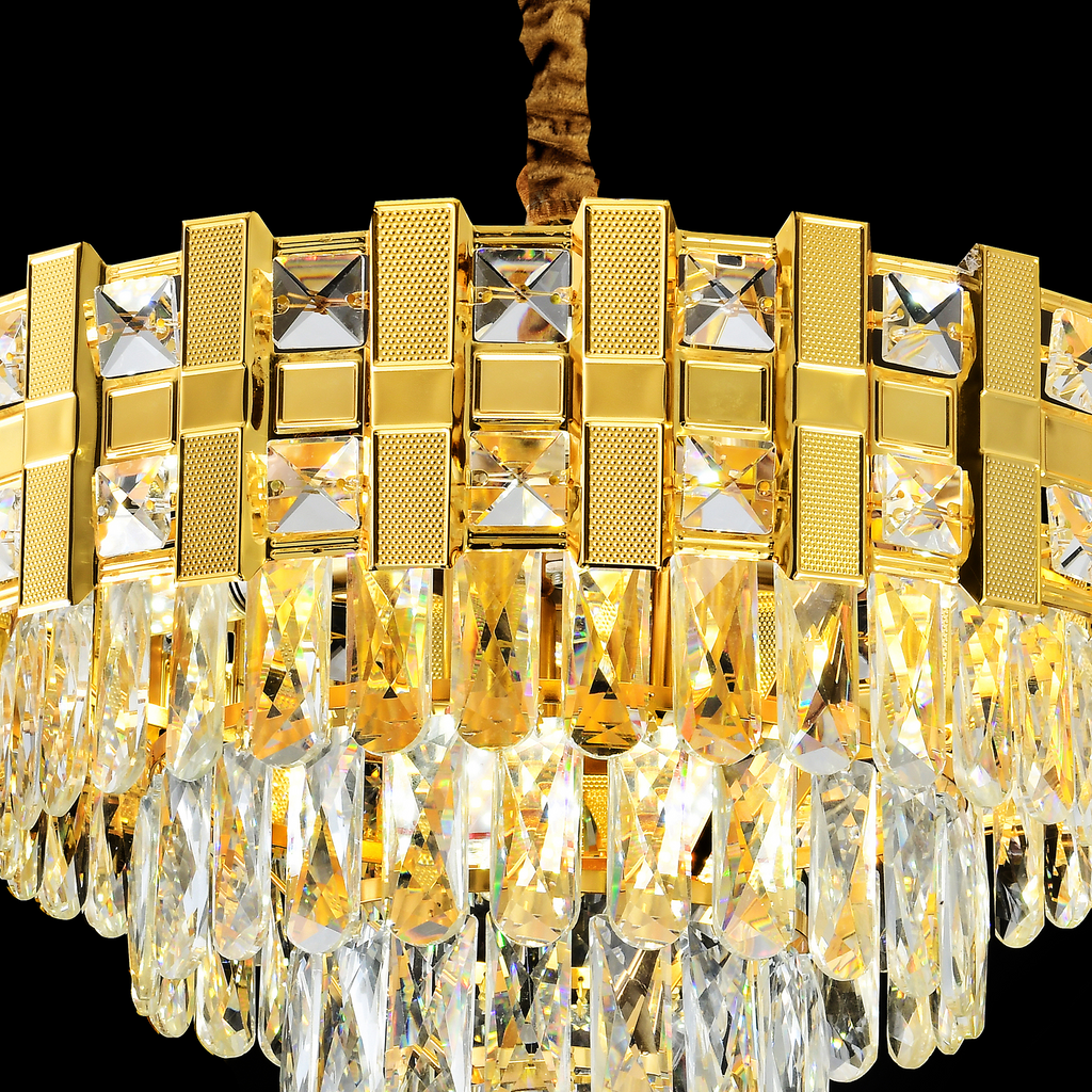 Structura aurie, perfect lucioasă, este decorată cu o compoziție spectaculoasă de cristale tăiate cu precizie, ce amplifică și reflectă lumina cu un efect vizual captivant. Cele 8 surse de lumină E14 oferă un nivel ridicat de iluminare, iar înălțimea reglabilă conferă flexibilitate în amplasare – fie deasupra unei mese elegante, fie într-un living sau hol generos.