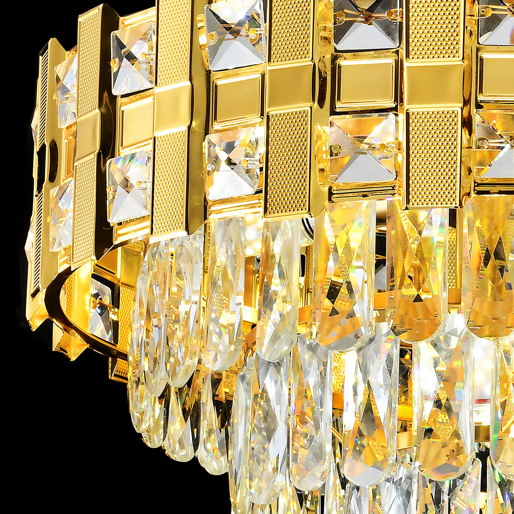 Combinația dintre finisajul auriu lucios și cristalele atent fațetate creează un spectacol de lumini și reflexii, punând în valoare rafinamentul fiecărui detaliu. Înălțimea reglabilă adaugă versatilitate și permite integrarea armonioasă în diferite tipuri de amenajări.