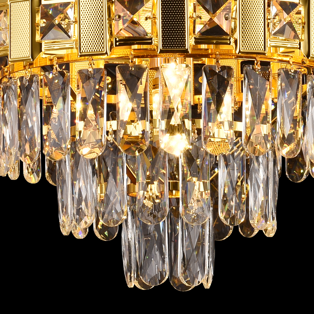 Corpul în finisaj auriu lucios este împodobit cu cristale fațetate, amplasate în straturi care creează un joc spectaculos de lumină. Cele 5 becuri tip E14 oferă o iluminare intensă și caldă, ideală pentru spații elegante precum sufragerii, holuri sau chiar dressinguri de lux. Înălțimea reglabilă permite adaptarea perfectă în funcție de context.