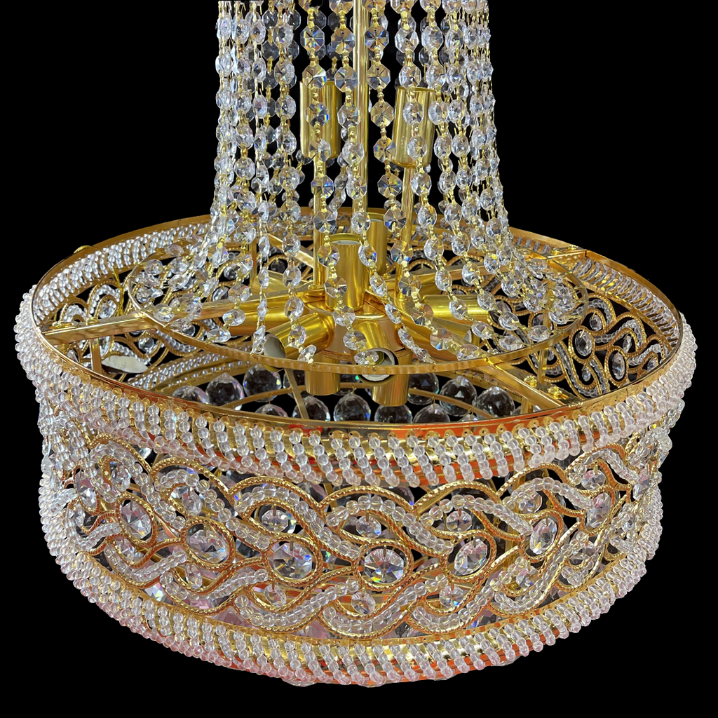 Un candelabru impunător, perfect pentru a deveni punctul central al încăperii, aducând strălucire, rafinament și prestigiu.