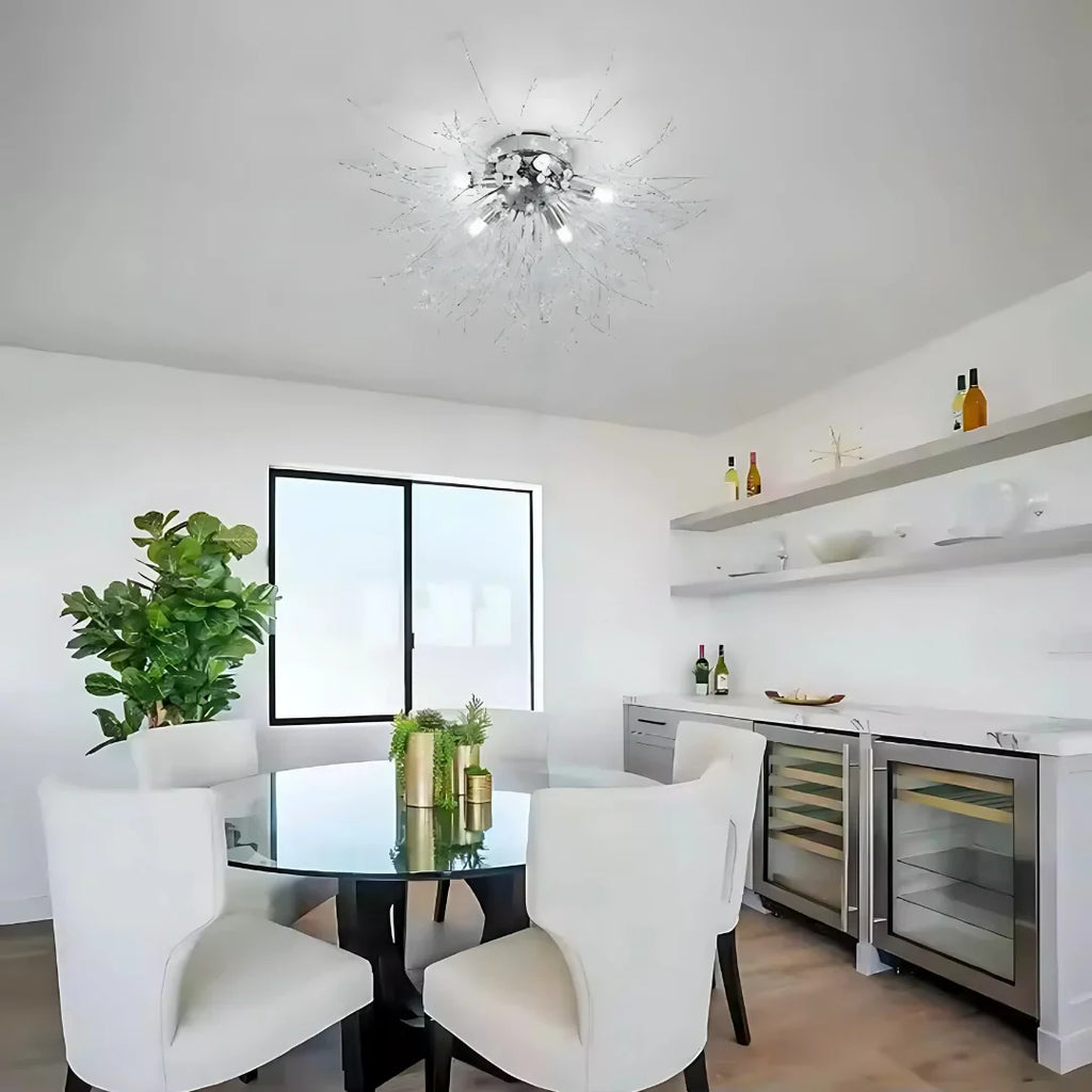 Finisaj Argintiu Lucios: Culoarea argintie lucioasă a structurii metalice adaugă o notă de modernitate și eleganță, reflectând lumina și amplificând strălucirea cristalelor.