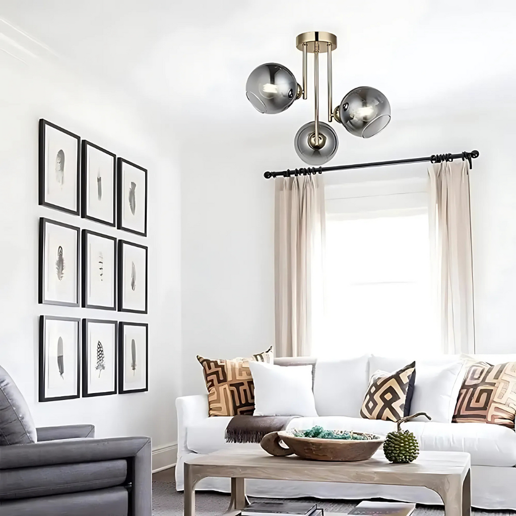 Structura metalica cu finisaj auriu si globurile din sticla fumurie creeaza un contrast elegant si o lumina difuza, contribuind la un ambient confortabil si relaxant. Bratele simetrice confera stabilitate estetica si un aspect modern fara a incarca vizual spatiul.