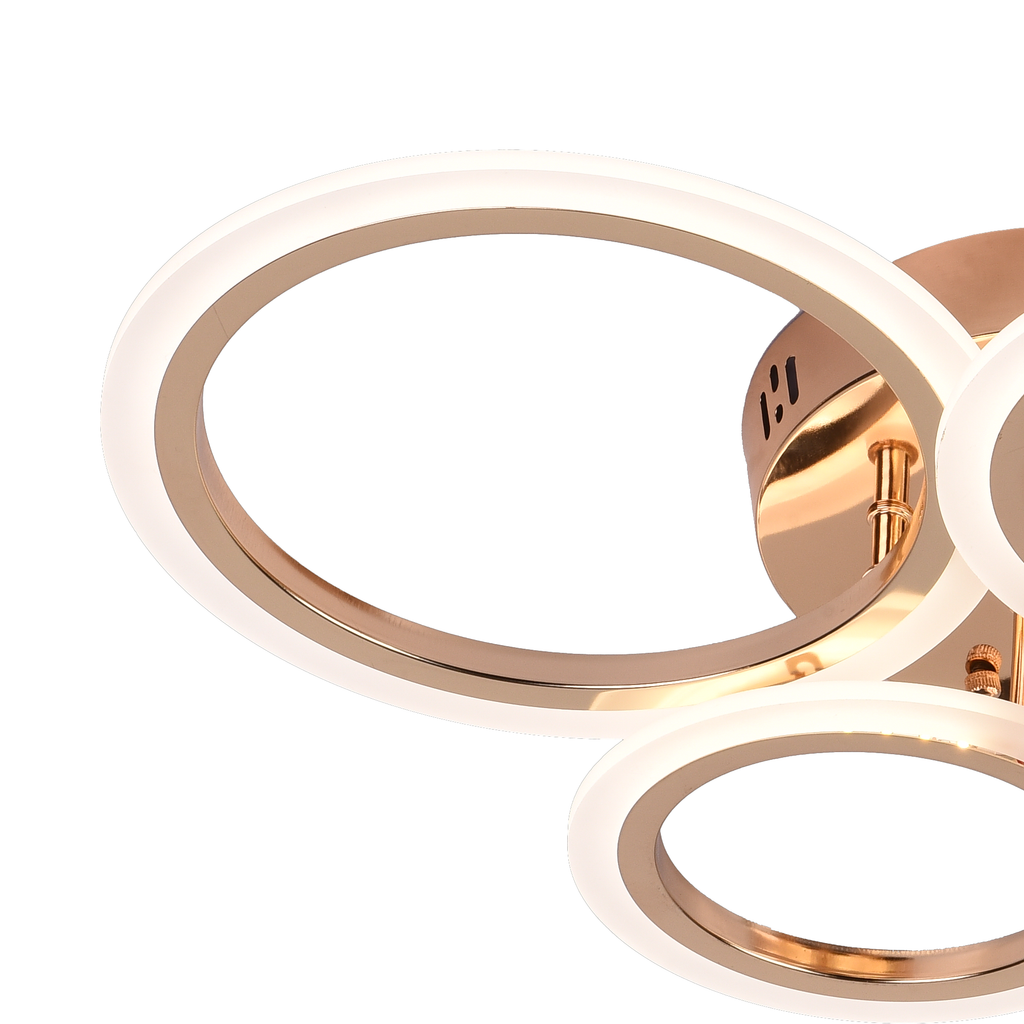 Lustra LED cu telecomandă BETTY este o piesă de iluminat modernă și elegantă, cu un design format din 4 cercuri interconectate, finisate într-un auriu lucios care adaugă o notă de lux și căldură. Cu o putere de 44W, oferă o iluminare versatilă și eficientă pentru diverse spații.