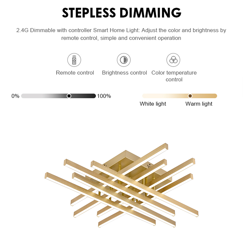 Lustra LED LINEX este alegerea perfectă pentru interioare elegante și moderne. Cu un design spectaculos, format din 8 elemente decorative aurii, oferă o iluminare intensă și uniformă datorită puterii de 108W LED integrat. Prin telecomanda inclusă, poți ajusta atât intensitatea luminii, cât și temperatura acesteia: 3000K (caldă), 4000K (neutră), 6000K (rece).