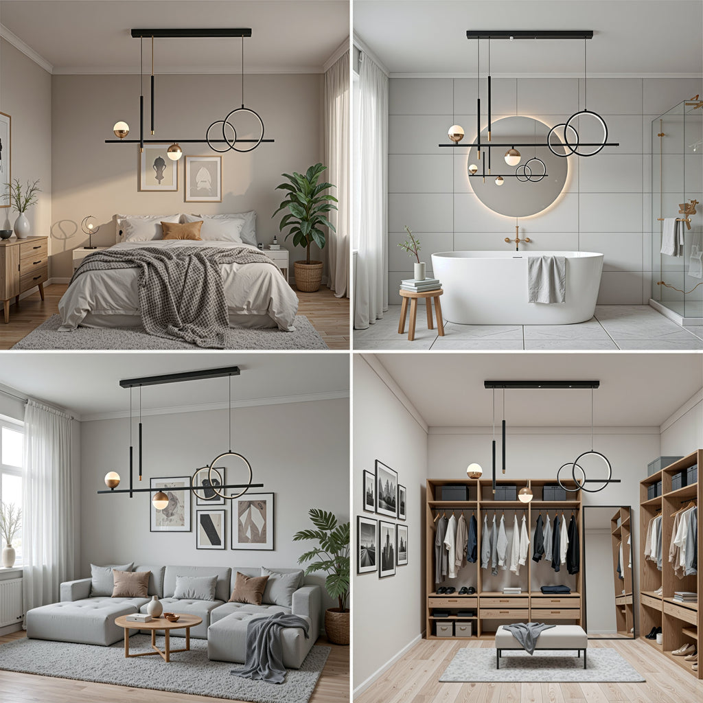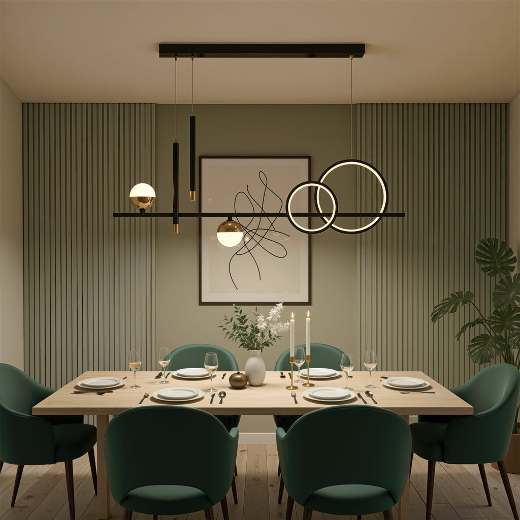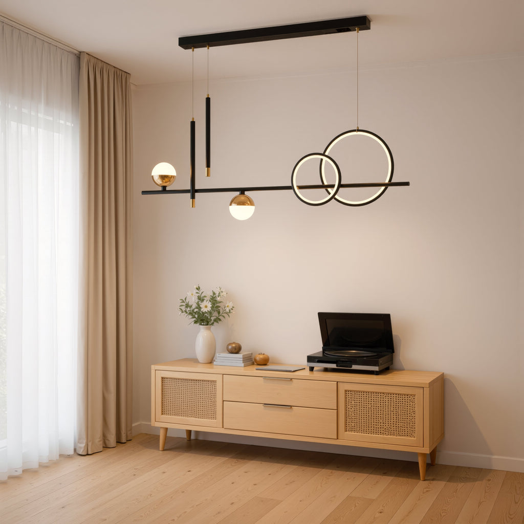 Finisajul negru accentuează liniile moderne ale designului și adaugă o notă de eleganță și sobrietate. Cu o putere de 44W, este potrivită pentru a ilumina livinguri, dormitoare sau zone de luat masa de dimensiuni medii.
