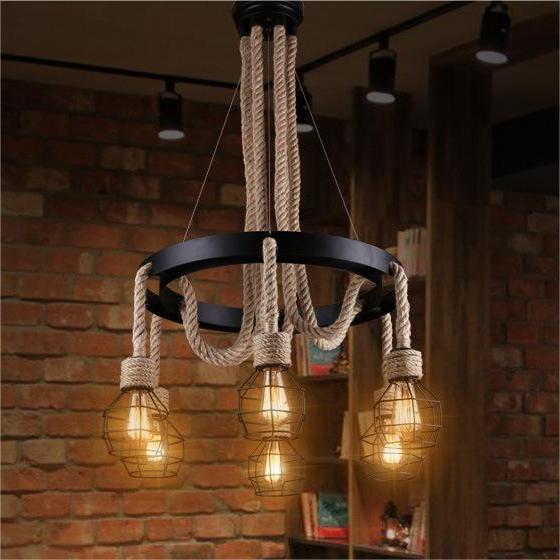 Design Unic, Inspiratie Rustica: Cu o structura circulara ce imita o roata, din metal maro, completata de trei pendule impletite din sfoara naturala, aceasta lustra ofera o estetica autentica, amintind de fermecatoarele spatii traditionale.