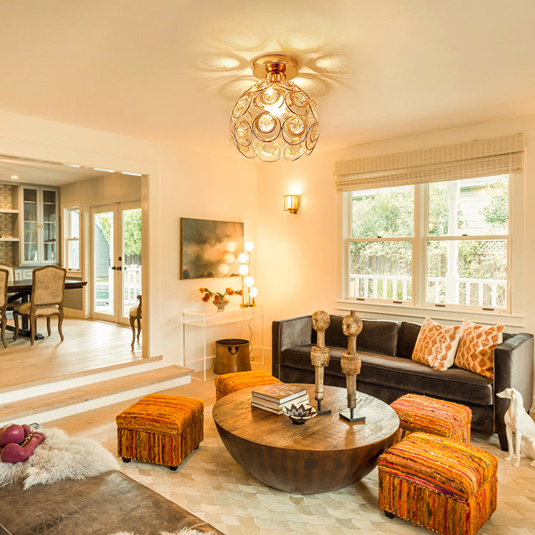 Funcționează la 220V și se montează aplicat pe tavan, fiind potrivită pentru living, hol, dormitor sau orice spațiu în care dorești un accent decorativ luminos. Structura este realizată dintr-o combinație premium de cristal, sticlă și metal, cu un finisaj auriu elegant, ce adaugă un plus de lux și strălucire încăperii.