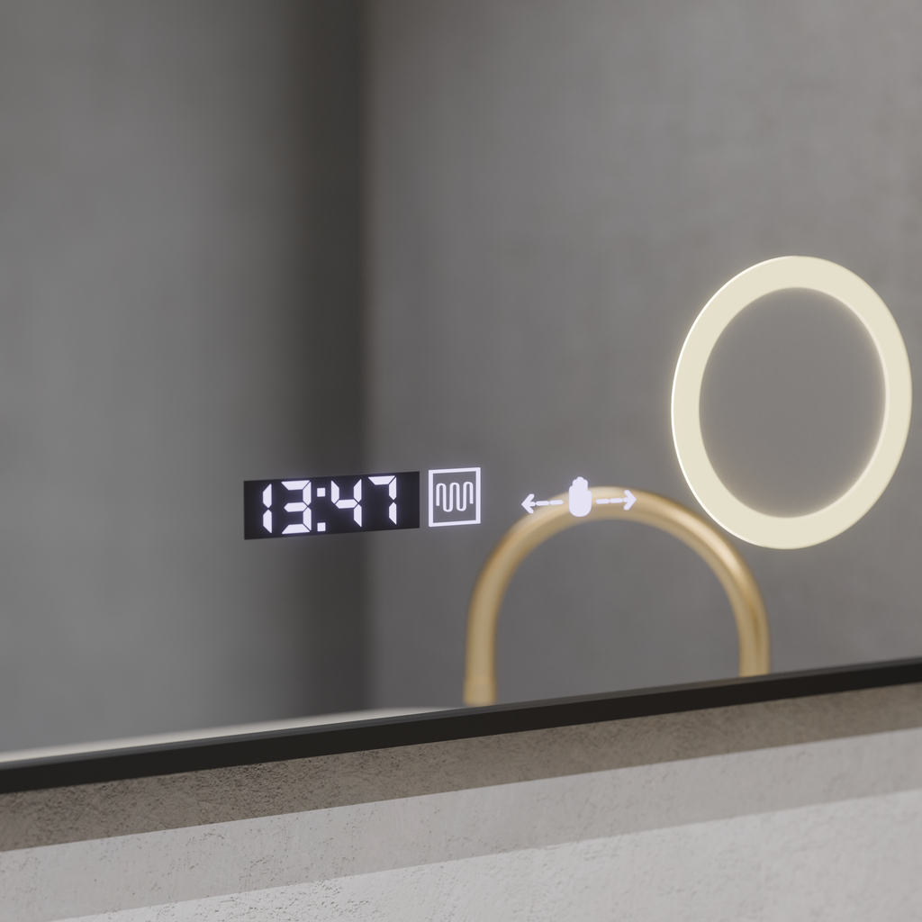 Oglinda LED Senzor MotionGlow Francesca 60x80 cm Lumina Calda/Rece/Neutra Dimabila Rama Negru Brushed Sistem Dezaburire Termometru Ceas Colectia Marcello Funghi
